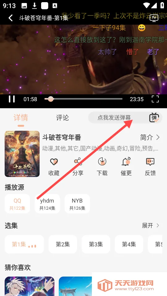 3、接着点击下方箭头所指的图标,还可以实时发送弹幕哦。