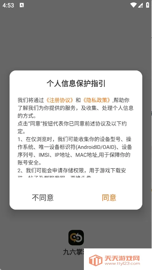 1、用户在本站下载九六掌玩app,点击同意。