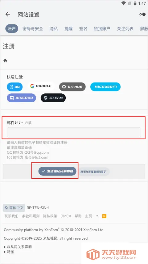 3、在注册界面输入邮件地址并点击下方的发送验证码到邮箱。