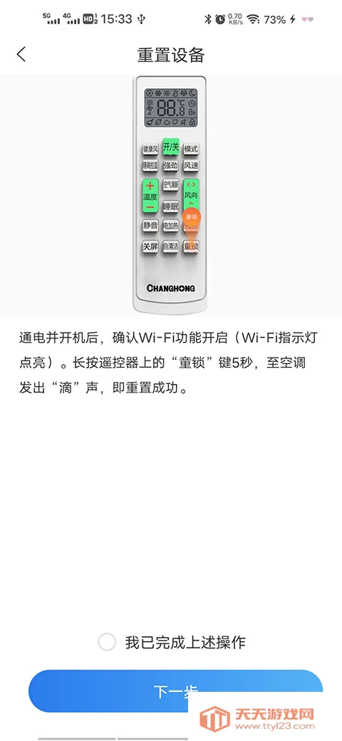4、将空调通电并开机后,确认Wi-Fi功能开启(Wi-Fi指示灯点亮)。长按遥控器上的“童锁”键5秒,至空调发出“滴”声,点击下一步。