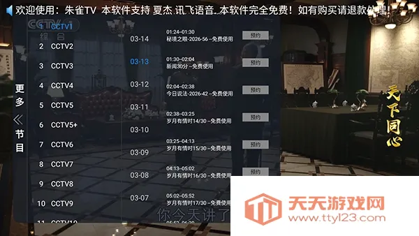 朱雀TV是免费无广告电视盒子,内置海量节目,有实时节目单可预约提醒。支持个性化设置,换台便捷,能收藏频道、切换线路。无广告干扰,节目全,满足多样视听需求,操作极简,播放流畅。