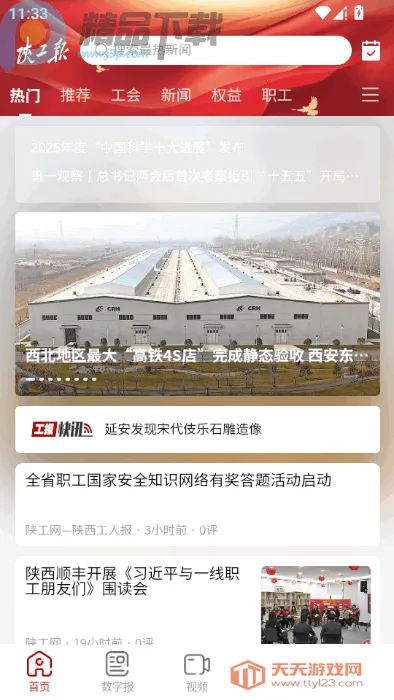 陕工报 app 是陕西工人报社打造的官方新闻客户端,是陕西工会新闻的权威发布平台。它聚焦工会动态与职工权益,提供政策解读、劳模事迹、技能提升等多元内容,支持短视频、数字报等全媒体形式,助力职工随时随地获取权威资讯与便捷服务。其工园页面能看到其他用户发表的动态,视频页面可查看最新新闻视频。通过它,职工能及时了解各类信息,无论是关注工会工作进展,还是获取对自身有益的知识技能,都十分方便。有了陕工报 app,职工获取资讯与服务变得轻松又高效。