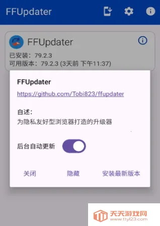 FFUpdater是移动端Firefox更新工具,能自动查最新版,免手动升级。还收录其他浏览器安装包。界面简洁,功能多样,可在线搜索,后台自动更新,保留书签等,升级包来自官方,安全稳定。