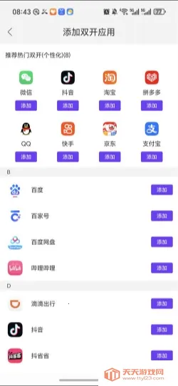 4.进入应用列表,选择要双开的应用,点击右侧【添加】;