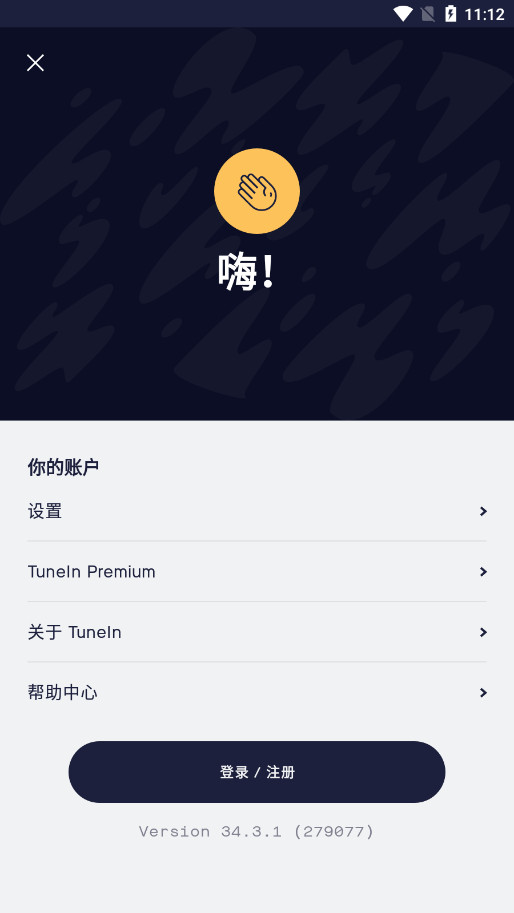 下载进入Tunein Radio软件,点击登录/注册