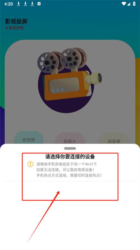 3、选择你要连接的设备,确保手机和电视处于同一个Wi-Fi下如果无法连接,可以重启电视设备!手机热点方式连接,需要同时连接热点