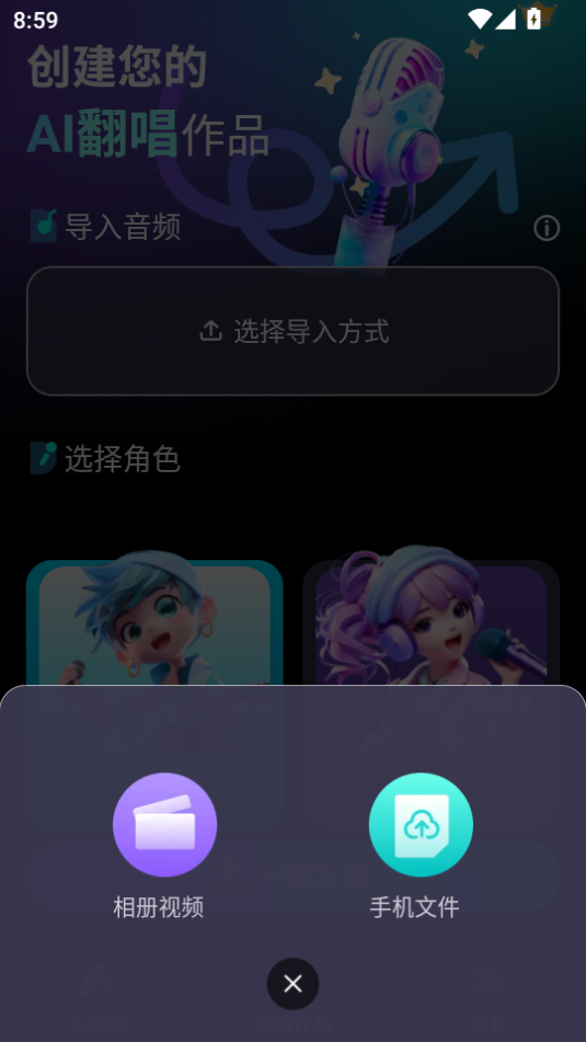 下载进入唱醒AI翻唱软件,你可以在这里选择导入方式导入音频
