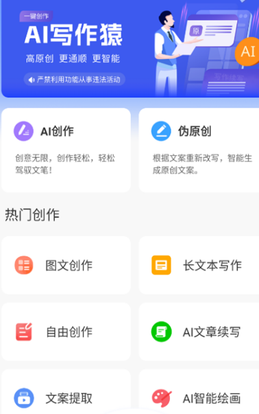 下载进入AI写作猿软件,这里有不同的功能可以使用