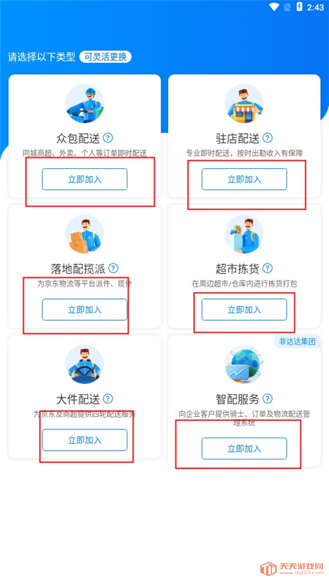 1、在本站下载安装并打开软件,使用电话号码进行注册,然后选择自己想要加入的骑手类型,小编这里选择了众包配送。