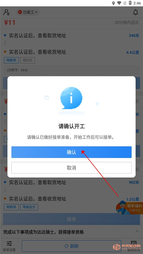 6、用户选择自己想要的订单点击确认开工即可进行接单配送。