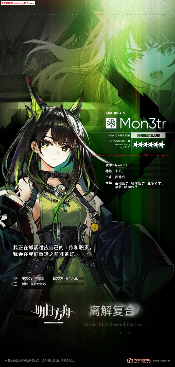 明日方舟期待已久的这次即将落地实装和开放获取的新六星医疗干员,也就是Mon3tr,涉及到的具体情报也正式公开了,来看看这次的新干员的设定,这次是变成了少女的M3。