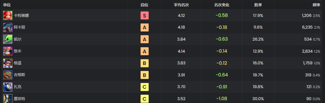 (3)铲子当前版本“指虎蔚”、“阿卡丽”、“悠米”、“船长”偏弱,先别玩,狗熊带适配神器时数据比云顶更好